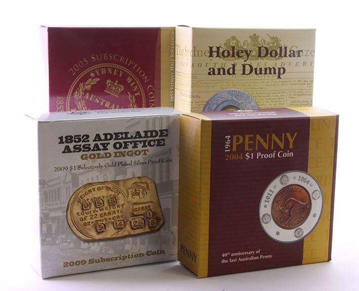 Proof One Dollar 2003 Dollar & Dump, 2004 Penny, 2005 Half Sovereign, 2009 Adelaide Assay (4)