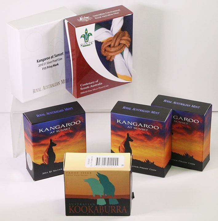 Proof fine silver Dollar, Kangaroo at sunset, 2010 (2), 2011; together with proof silver 1oz, Kangaroo at sunset, F15 privy mark; plus proof Five Dollars, Scouts, 2010 and Proof 1/2oz silver Kookaburra, 2005 (6 coins)