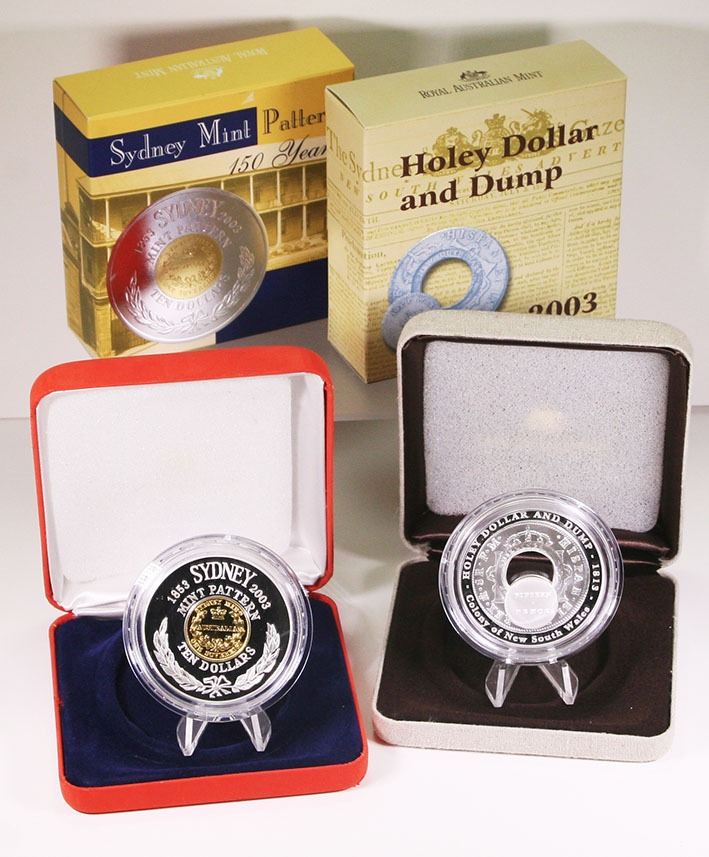 Proof Silver One Dollar, Holey Dollar & Dump; Proof Silver Ten Dollars, Sydney Mint Pattern 150th Anniversary, 2003