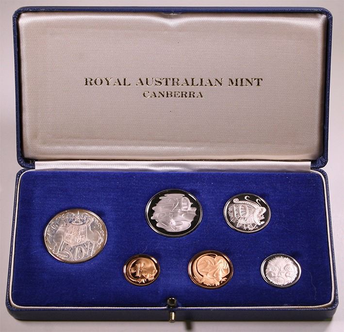 Australia, proof sets, 1966, dark blue case, obverse a little foggy on Fifty Cents, else a nice clean set