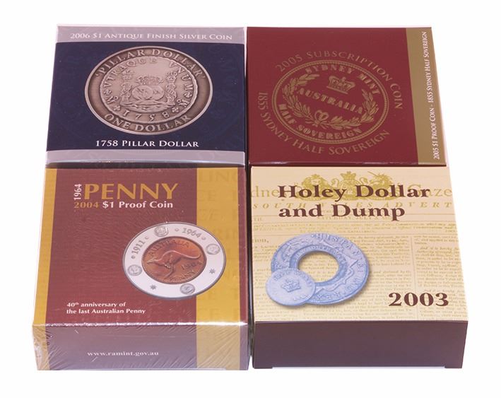 Proof Silver One Dollar Issues, 2003 Holey Dollar & Dump, 2004 Penny (unopened), 2005 Half Sovereign, 2006 Pillar Dollar (4 coins)