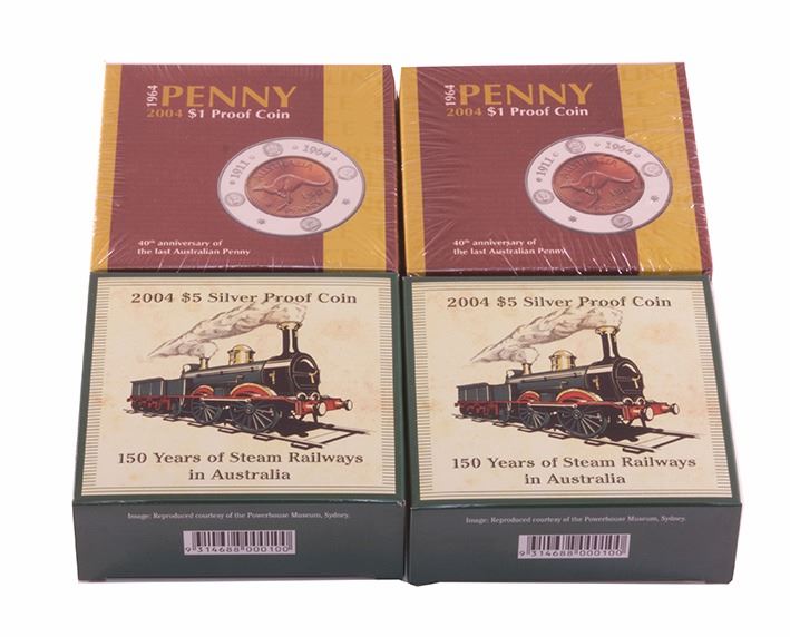 Proof Silver One Dollar Issues, 2004 Penny (2, unopened); plus Proof Five Dollars 1oz Silver Issue, 2004 Steam Railways (2) (4 coins)