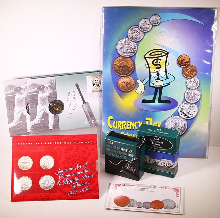Predecimal sets, in private packaging, Renniks, Sherwood Florin set, Sherwood Predecimal and Decimal set; together with proof One Dollar, 1984 (2, without outer card box); silver One Dollar, 1997 Old Parliament, fine silver One Dollar, 1994 Decade; plus uncirculated Five Dollars, PNC, 1997 Bradman (2) (9 items)