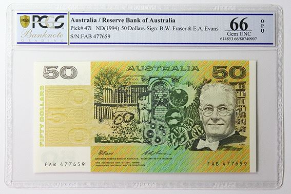 Australia, QEII, Fifty Dollars, Fraser/Evans, 1993 (R.515L), FAB/477659, Last Prefix, PCGS Gem Unc 6