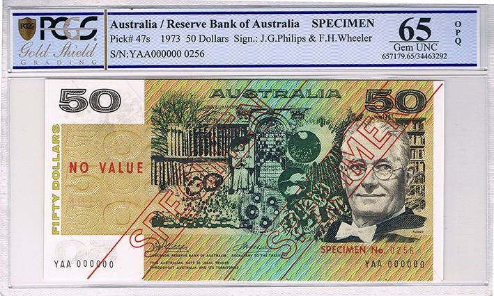 Australia, QEII, Fiifty Dollars, Phillips/Wheeler, 1973, Type III Specimen, YAA 000000 - PCGS 65 OPQ