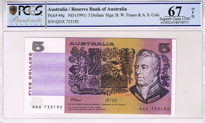 Australia, QEII, Five Dollars, Fraser/Cole, 1991, First Prefix, PCGS Superb Gem UNC 67 OPQ