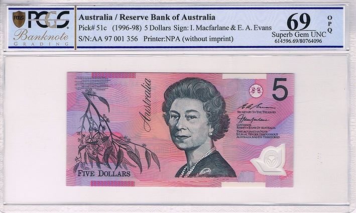 Australia, QEII, Five Dollars, MacFarlane/Evans, 1997, PCGS Superb Gem UNC 69 OPQ