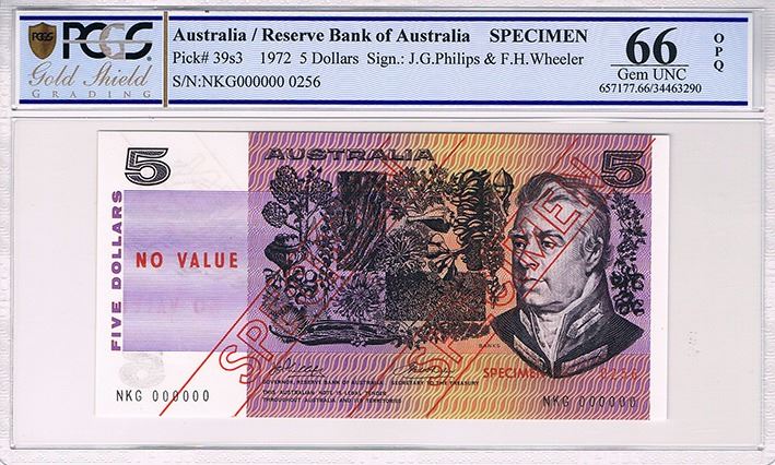 Australia, QEII, Five Dollars, Phillips/Wheeler, 1974, Type III Specimen, NGK 000000 - PCGS 66 OPQ