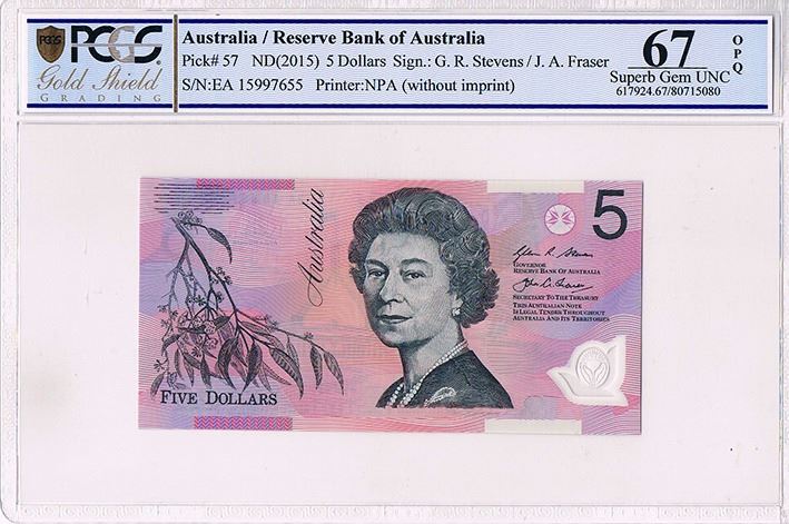 Australia, QEII, Five Dollars, Stevens/Fraser (R224dL), 2015, Last Prefix, PCGS 67 Superb Gem Unc OP