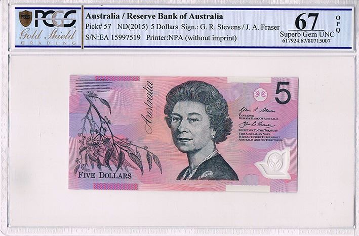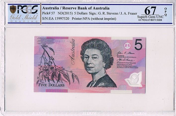 Australia, QEII, Five Dollars, Stevens/Fraser (R224dL), 2015, Last Prefix, PCGS 67 Superb Gem Unc OP