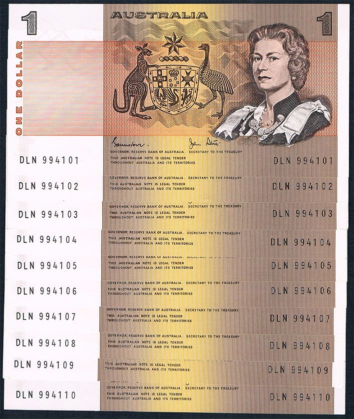 Australia, QEII, One Dollar, Johnston/Stone, 1982 (R.78), run of ten consecutive notes, graded as almost uncirculated (10 notes)