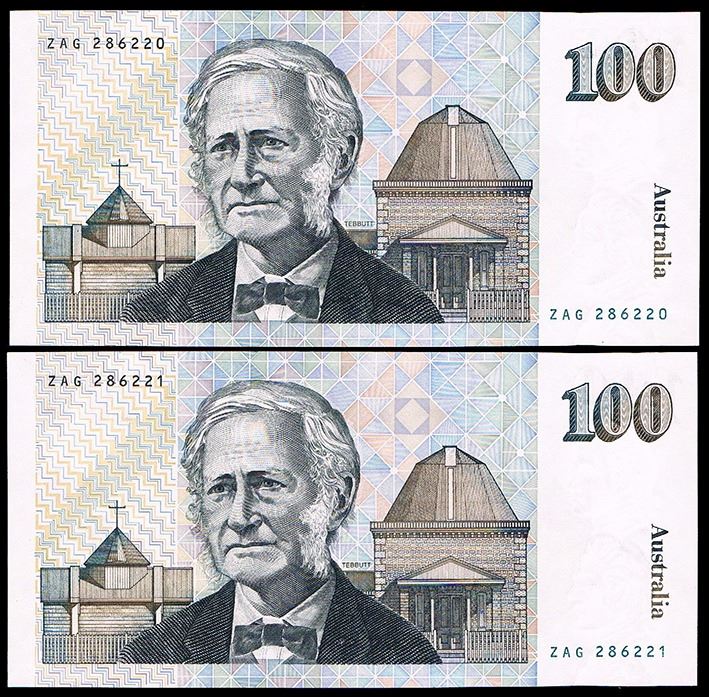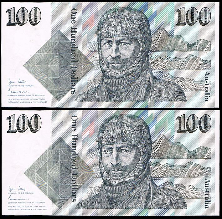 One Hundred Dollar, Johnston/Stone, 1984 (R.608), ZAG/286220-21, light handing marks, graded as almost uncirculated (2 notes)