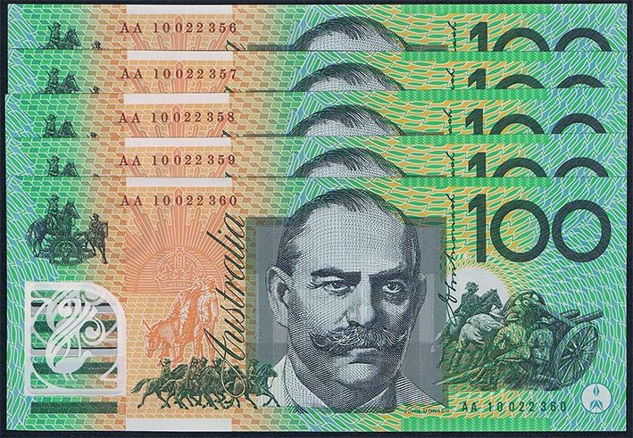 One Hundred Dollars, Stevens/Henry, 2010 (R.621bF), first prefix, consecutive run of five notes, AA10022356-60, uncirculated (5 notes) see previous lot for consecutive numbers