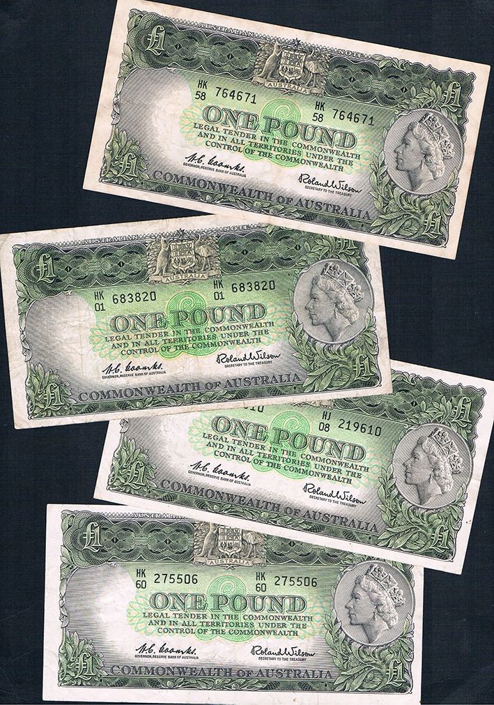 One Pound, Coombs/Wilson, 1961, Reserve, dark green (2), emerald green (2), one with microscopic pin hole, else graded as good fine (4 notes)