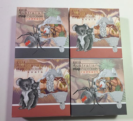 Perth Mint, Proof Silver One Dollar, 2014-15, Australian Map Shaped Coins, Koala 2014 (2); Red back 2015 (2), all in original packaging (4 coins)