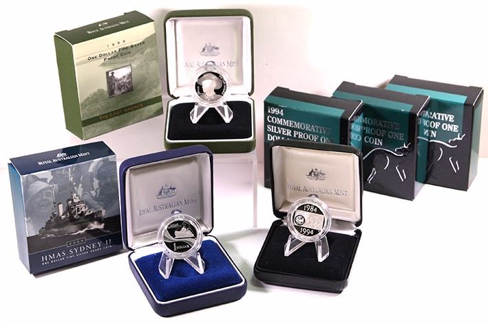 Proof fine silver One Dollar, 1994 Decade (3), 1999 Last Anzacs, 2000 HMAS Sydney II, all in original packaging with certificates (5 coins)