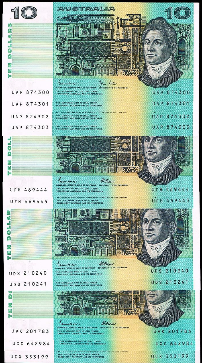 Ten Dollars, Johnston/Stone, 1983, consecutive run of four notes, UAP/874300-03; together with Ten Dollars, Johnston/Fraser, 1985 (7), two consecutive pairs, UDS/210240-41 and UFH/469444-45 plus three single notes; (R.308 (4), 309 (7)), graded as good extremely fine - virtually uncirculated (11 notes)
