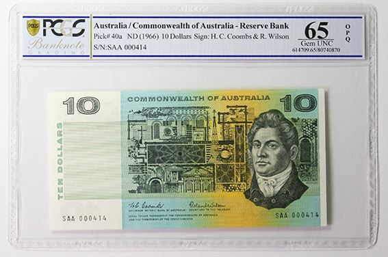 Australia, QEII, Ten Dollars, Coombs/Wilson, 1966 (R.301F), First Prefix, SAA/000414, PCGS Gem Unc 6