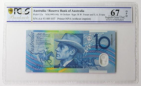Australia, QEII, Ten Dollars, Fraser/Evans, 1993 (R.316aF), AA93/005037, First Prefix, PCGS Superb G