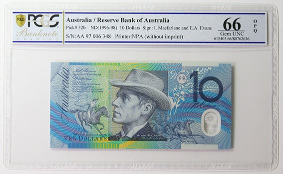 Australia, QEII, Ten Dollars, MacFarlane/Evans, 1997 (R.318bF), AA97/006348, First Prefix, PCGS Gem