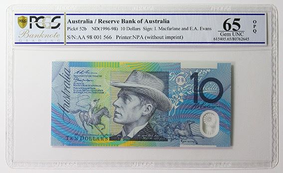 Australia, QEII, Ten Dollars, MacFarlane/Evans, 1998 (R.318cF), AA98/001566, First Prefix, PCGS Gem