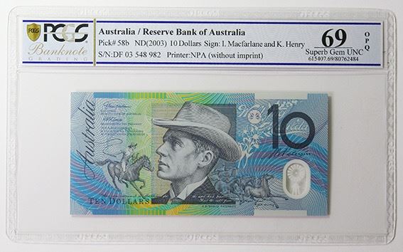 Australia, QEII, Ten Dollars, MacFarlane/Henry, 2003 (R.320bL), DF03/548982 First Prefix, PCGS Super