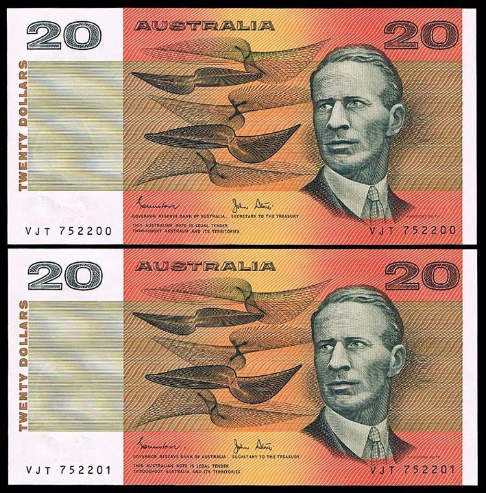Twenty Dollars, Johnston/Stone, 1983 (R.408), VJT/752200-01, consecutive pair, almost uncirculated (2 notes)