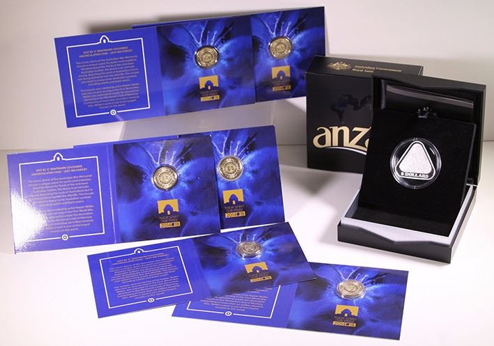 Proof silver Five Dollars, 2015, Anzac Triangle; together with uncirculated Two Dollars, 2017-C, Lest We Forget (6) (7 coins)