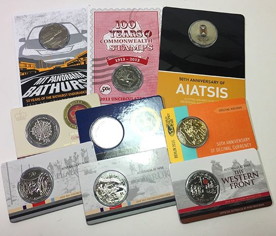 Uncirculated Fifty Cents, 2010 Royal Engagement; 2013 Commonwealth Stamps; 2013 Bathurst; 2013 Coronation; 2014 AIATSIS coloured issue; 2014 The Western Front; 2015 El Alamein; 2015 Tobruk; 2016 Gold Plated Round, Berlin World Money Fair, some scarcer issues, the fifth with high catalogue value (9 coins)
