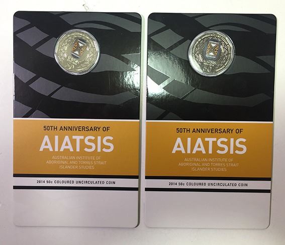 Uncirculated Fifty Cents, 2014 AIATSIS coloured issue, very sort after issue with high catalogue value (2 coins)