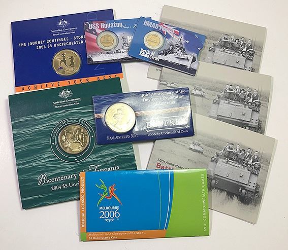 Uncirculated Five Dollars, 2002 HMAS Perth & USS Houston pair, 2004 Bicentenary of Tasmania, 2004 Sydney to Athens, 2006 Melbourne Games, 2006 Duyfken, 2016 Battle of Long Tan (3), all in original packaging, the last recent issues (9 coins, F/V = $45)