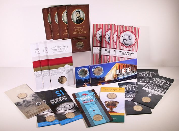 Uncirculated One Dollar, 2007 Peacekeeping; 2011 Presidents Cup; 2011 Ram's Head A, C, P, S; 2012 Wheat Sheaf; 2012 Bluebell C (2); 2013 Holey Dollar, B, C, M; 2014 Terra Australia B, M, P, S; 2014 Anniversary S (2); 2016 Australia's First Mint C (2), S, all in original packaging (21 coins)