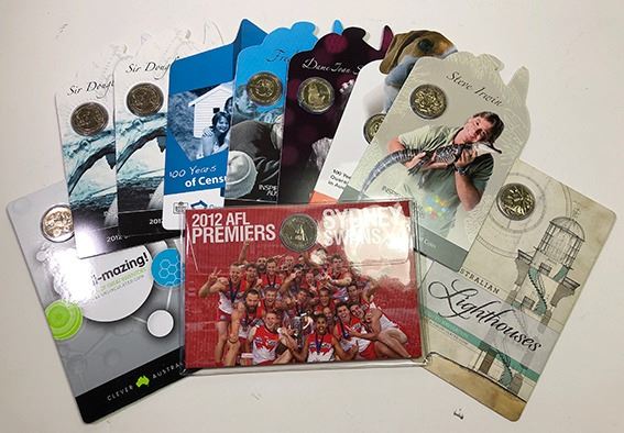 Uncirculated One Dollar, 2008 Quarantine; 2009 Steve Irwin; 2010 Fred Hollows; 2011 Dame Joan Sutherland; 2011 Census; 2012 Sydney Swans; 2012 Douglas Mawson (2); 2014 Medi-mazing!; 2015 Australian Lighthouses, all in original packaging (10 coins)