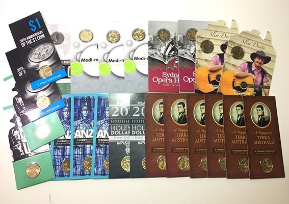 Uncirculated One Dollar, 2013 Slim Dusty (2); 2013 Sydney Opera House (2); 2013 Holey Dollar & Dump, 'S' counterstamp (2); 2014 Medi-mazing! (3); 2014 30th Anniversary of the Dollar (2); 2014 30th Anniversary of the Dollar Coloured Coin; 2014 Terra Australis B (2), C (2), S (2); 2014 World War I, Albany 'A' counterstamp (2); 2015 Anzac Centenary, B (2), S (2), all in original packaging (24 coins)
