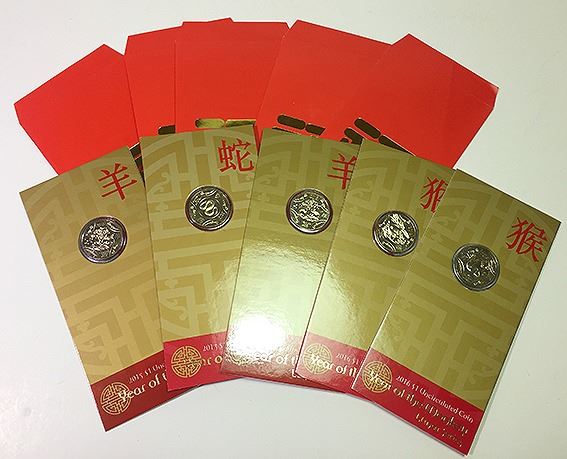 R.A.M, Uncirculated One Dollar, Lunar Series, 2013 Year of the Snake; 2015 Year of the Goat (2); 2016 Year of the Monkey (2), all with red outer envelopes, in original card packaging (5 coins)