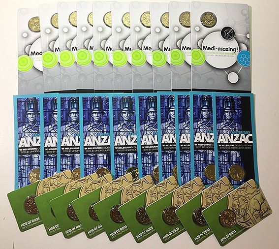 Uncirculated One Dollar, 2014 Medi-mazing! (10); 2015 Centenary Anzac 'M' counterstamp (10); 2015 Mob of Roos 'P' privy mark (9), all in original packaging (29)