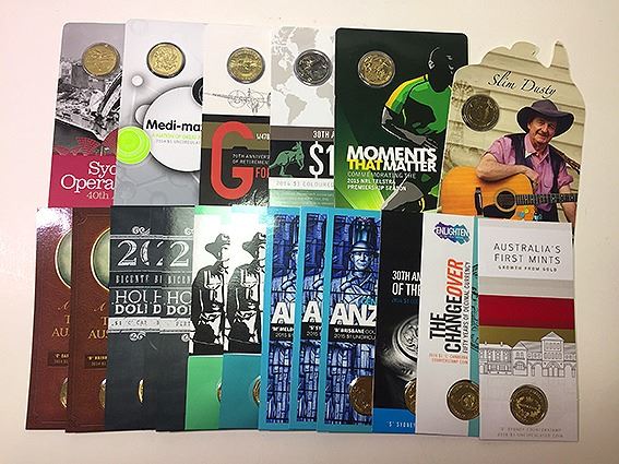 Uncirculated One Dollar, 2013 Slim Dusty; 2013 Sydney Opera House; 2013 Holey Dollar & Dump B, C, P; 2014 G for George; 2014 Medi-mazing! (2); 2014 30th Anniversary of the Dollar 'S' counterstamp; 2014 30th Anniversary of the Dollar Coloured coin; 2014 Terra Australis B, C; 2014 World War I, Albany 'A' and Shine of Remembrance 'M' counterstamp; 2015 Anzac Centenary, B, M, S; 2015 Moments that Matter 'S' mint mark; 2016 Changeover 'C' mint mark; 2016 Australia's First Mints 'S' mint mark, all in original packaging (19 coins)