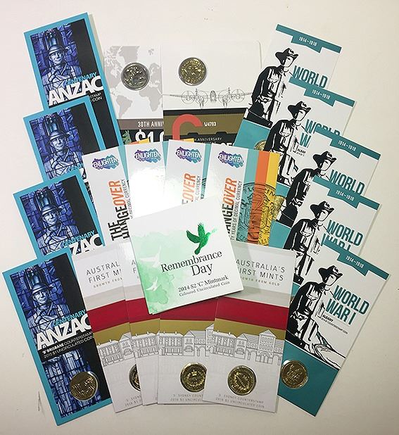 Uncirculated One Dollar, 2014 30th Anniversary of the Dollar Coloured Coin; 2014 G for George; 2014 World War I, Albany 'A' counterstamp (5); 2015 Centenary Anzac, B (3), M; 2016 Australia's First Mint, S (4); 2016 Changeover C (4); together with uncirculated Two Dollars, C mint mark, all in original packaging (20 coins)