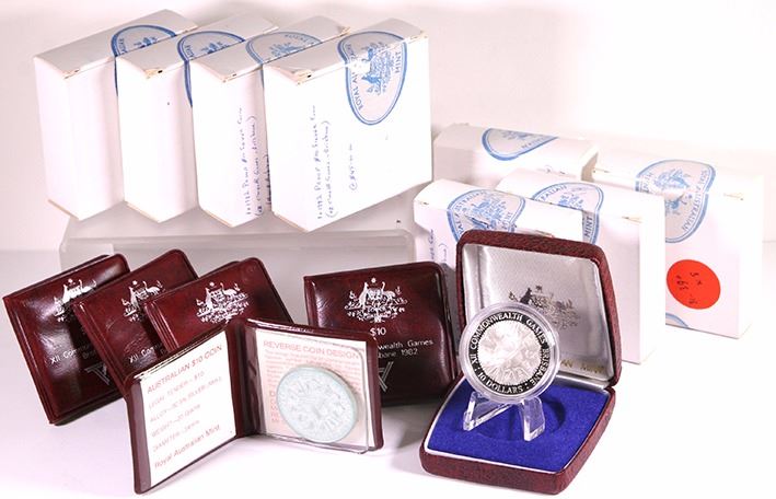 Uncirculated Ten Dollars, 1982 Games (5); proof Ten Dollars, 1982 Games (8), writing on outer card box (13 coins)