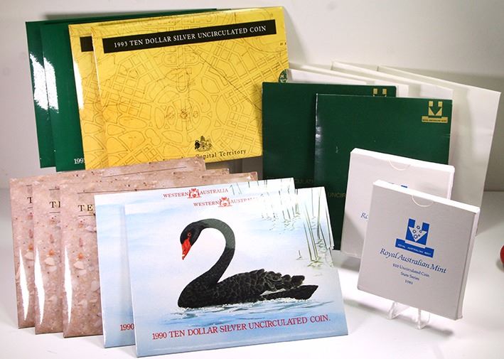 Uncirculated Ten Dollars, 1985 VIC (2), 1986 SA (2), 1987 NSW (2), 1988 Bicentennial (2), 1989 QLD (3), 1990 WA (2), 1991 TAS (2), 1993 ACT (2), all in original packaging (17 coins)