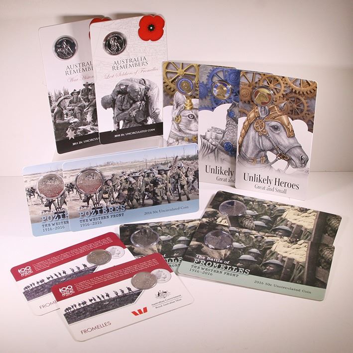 Uncirculated Twenty Cents, 2010 Lost Soldiers, 2011 War Historians, 2016 Westpac Anzac series, Fromelles (2); together with uncirculated Fifty Cents, 2016 Pozières (2), Fromelles (3); plus uncirculated One Dollar, Unlikely Heroes, 2015, Cat, Donkey, Pigeon, a few with pin holes through packaging, else fine, a nice little military themed lot! (12 coins)