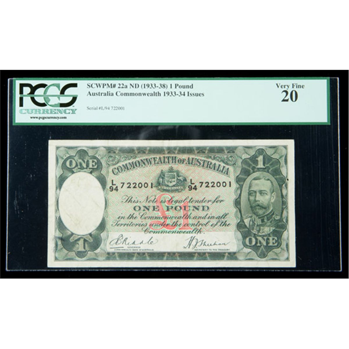 Australia SCWPM# 22a, ND (1933-38) 1 Pound. PCGS Very Fine 20. . Fr-P-22a. A pleasing mid-grade example.