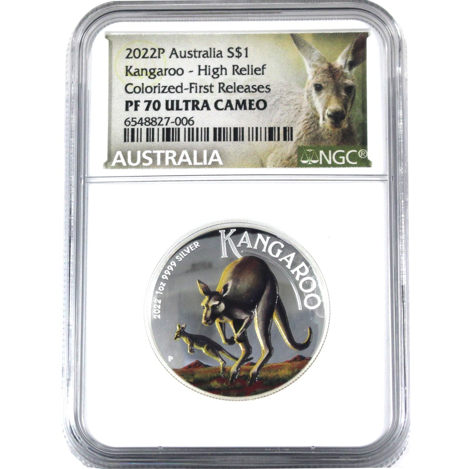 Australia Silver 2022P $1 High Relief Kangaroo Colourized NGC PF70 Ultra Cameo *First Releases*. Comes with Original Packaging and COA. 1oz .9999 Silver w/ Selective Colour (Tax Exempt)