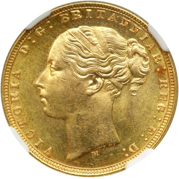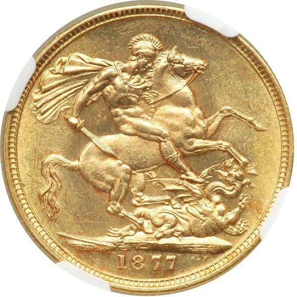 Australia. Sovereign, 1877-M. S.3857; Fr-16; KM-7. Weight 0.2355 ounce. Victoria. Young head. Reverse: St. George. A lovely original lustrous example. NGC graded MS-62.