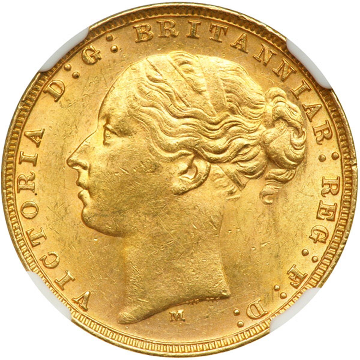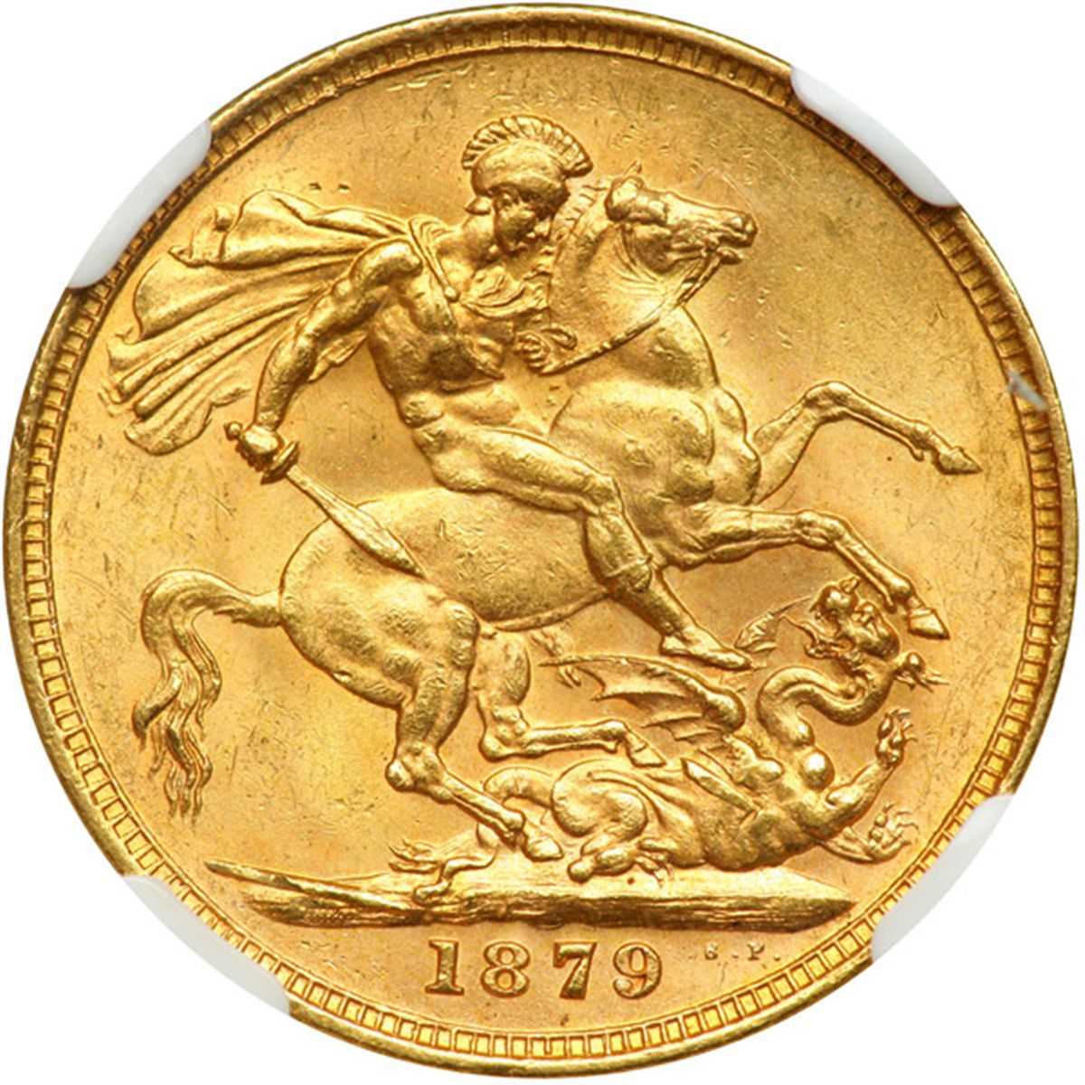 Australia. Sovereign, 1879-M. S.3857; Fr-16; KM-7. Victoria. Young head. Reverse: St. George. Lustrous. NGC graded MS-62.