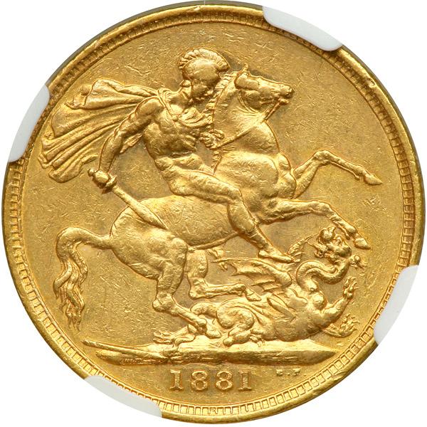 Australia. Sovereign, 1881-M. KM-7. Victoria. Young head. Reverse: St. George. NGC graded AU-50.