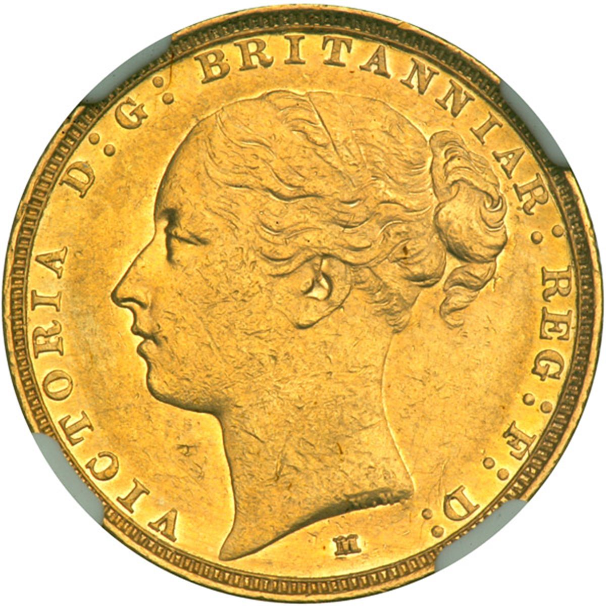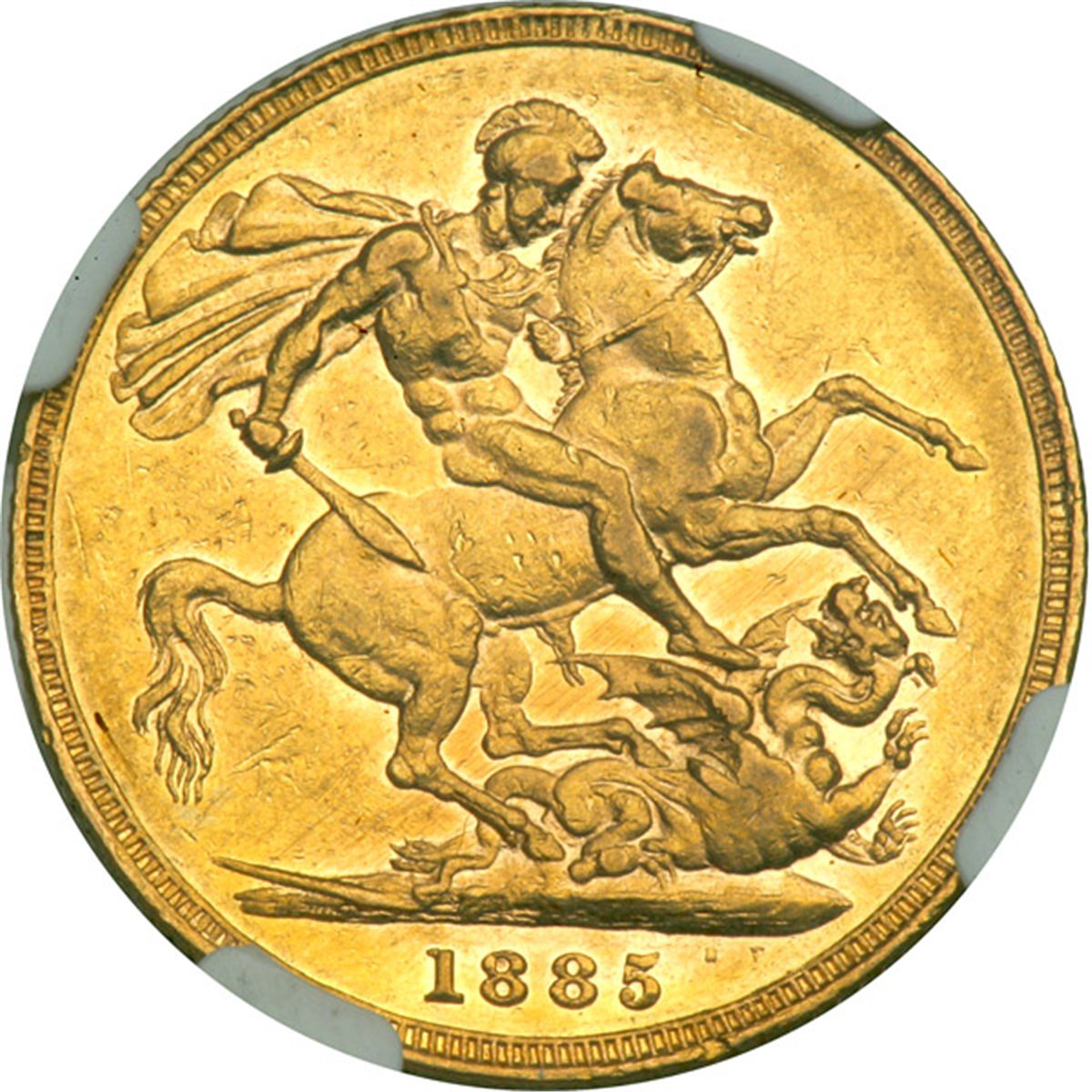 Australia. Sovereign, 1885-M. Fr-16; KM-6. Weight 0.2355 ounce. Victoria. Young head. Reverse: St. George. NGC graded About Uncirculated, Details (Surface Hairlines).