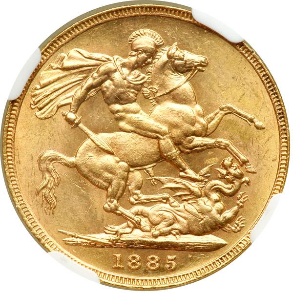 Australia. Sovereign, 1885-M. S.3857C; Fr-16; KM-7. Weight 0.2355 ounce. Victoria. Young head. Reverse: St. George. Sharply struck example with lovely bold mint luster. A choice coin and very scarce this nice. NGC graded MS-64.