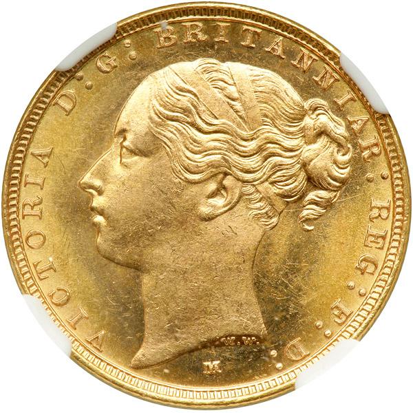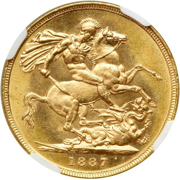 Australia. Sovereign, 1887-M. S.3857C; Fr-16; KM-7. Weight 0.2355 ounce. Victoria. Young head. Reverse: St. George. A very choice example with sharp hair detail and bold original luster. NGC graded MS-64.
