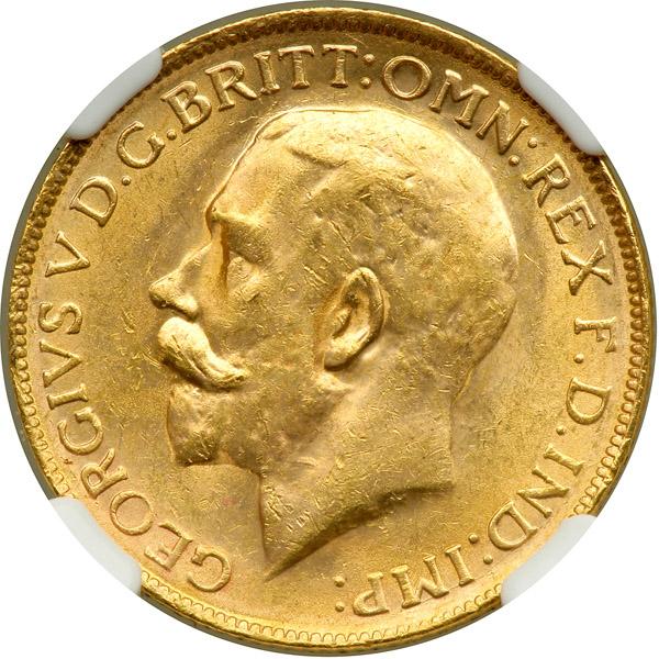 Australia. Sovereign, 1923-P. Fr-40; KM-29. Weight 0.2355 ounce. George V. Head left. Reverse: St. George. NGC graded MS-63.